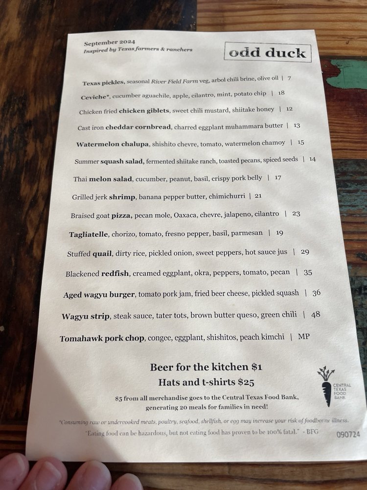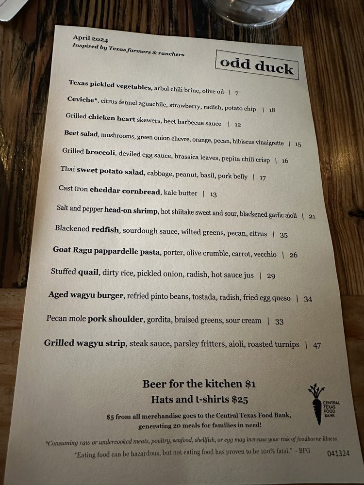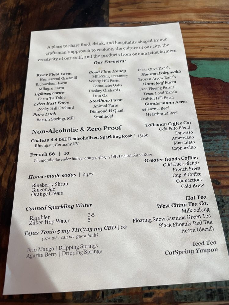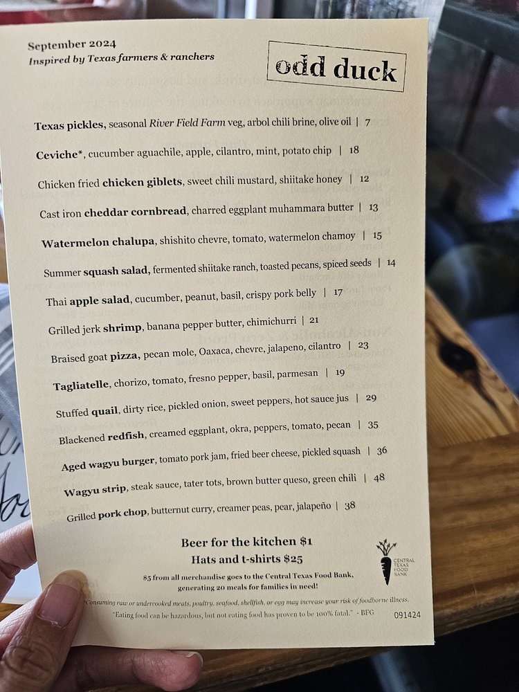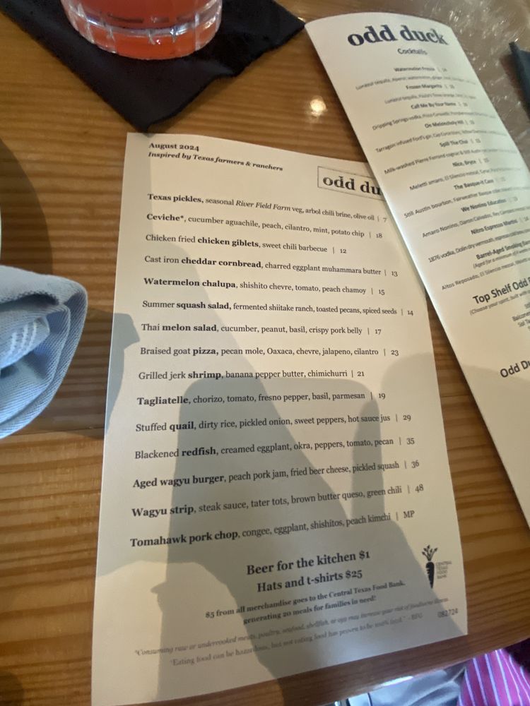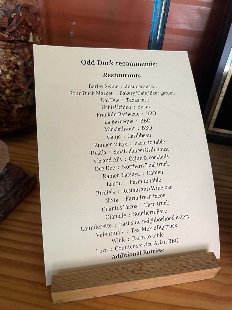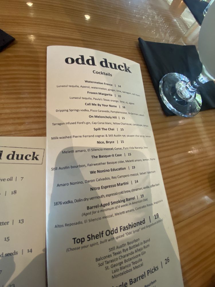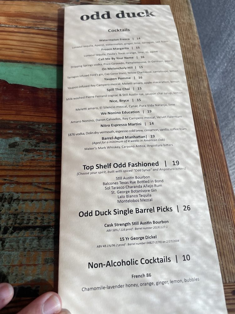 The bar offers a full range of drinks, including unique cocktails like the "Spill The Chai," and happy hour specials that make dining here even more enjoyable. Whether you're looking for a new spot for date night or a place to try high-end dining in a casual setting, Odd Duck promises to deliver a memorable culinary experience.